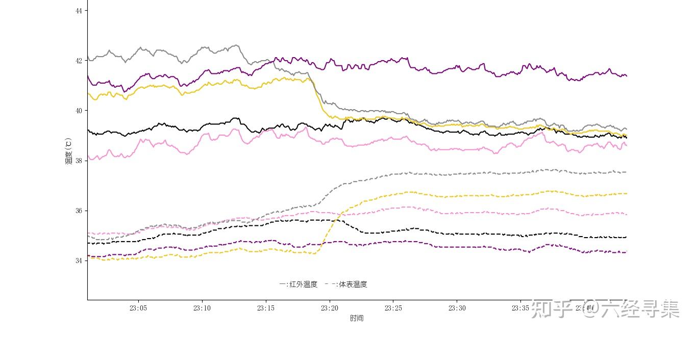 从图中可以看出,对应手少阴心经(紫色)红外-体表温度间距(实线-虚线间距)明显大于(而非小于)手太阳小肠经(黑色)的间距,因此并不是起初怀疑的四逆散证。此外,从23:18开始,手太阴肺经(灰色)和手阳明大肠经(黄色)都出现红外温度下降而体表温度上升的情况,这是下游经络气血不再流通的表征。由此可知,手阳明经或者下游足阳明经出了问题。据此判断,患者可能有阳明经表证(葛根汤证)或者阳明经血淤。进一步在患者腿上按压条口和下巨虚,有明显压痛,所以判断为血淤,并针刺左手合谷、左腿上巨虚、条口和下巨虚。针刺后不久,患者就感觉脸上没那么烫了。针刺结束后半小时内体温下降到38.2度(但未出汗)。另外,起针时条口出血很多,也是血淤导致阳明经气血不能流通的旁证。